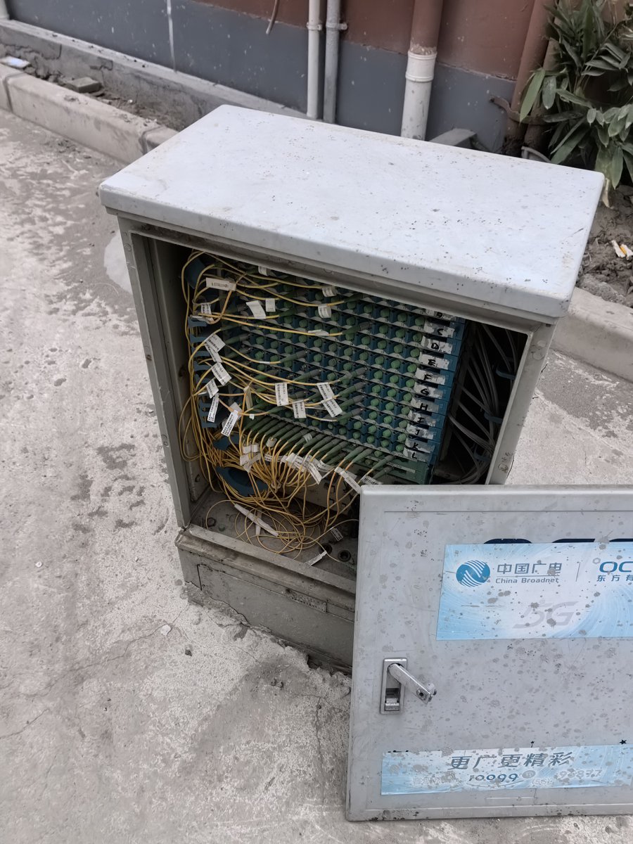 3个“横”出来的弱电箱在哪?在平塘路456弄26号楼北侧,一排临时停车位的西端,记者找到了其中的2个。箱子都是铁皮制成,半人高,半米余宽,箱门上标注了“中国移动”和“中国联通”标志。箱子均上了锁,多股黑色线缆从箱子底部接出来后向上延伸,最终并入小区天空中密布的架空线缆束中;第3个弱电箱则位于甘溪路100弄23号楼的西侧,箱体上印有“中国广电|东方有线”的标志。箱门锁坏了,铁丝绕着箱体捆扎了一圈取代了锁。记者解开铁丝打开箱子,可以看到里面是一排排的光纤接口,不少接口上插有细光纤,并汇总成了5根较粗的黑色线缆钻入地下,再从不远处的墙根处钻出,沿墙向上延伸后也并入小区架空线缆束。看得出,这些弱电箱是电信运营商布设在小区的交接设备。